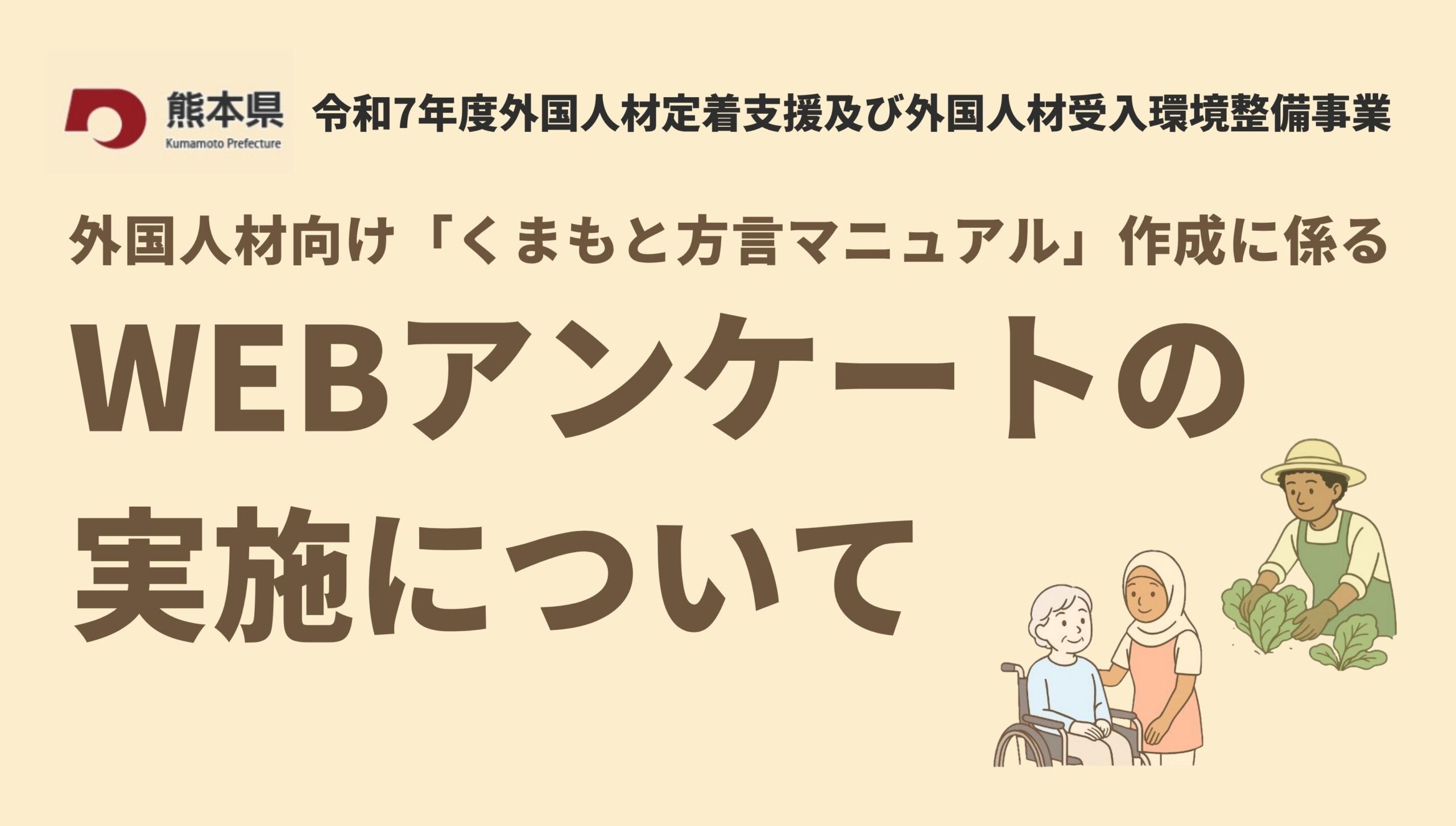 この度、熊本県 令和7年度外国人材定着支援及び外国人材受入環境整備事業 外国人材向け「くまもと方言マニュアル」作成に係るWEB アンケートを実施することになりましたので、ご案内いたします。