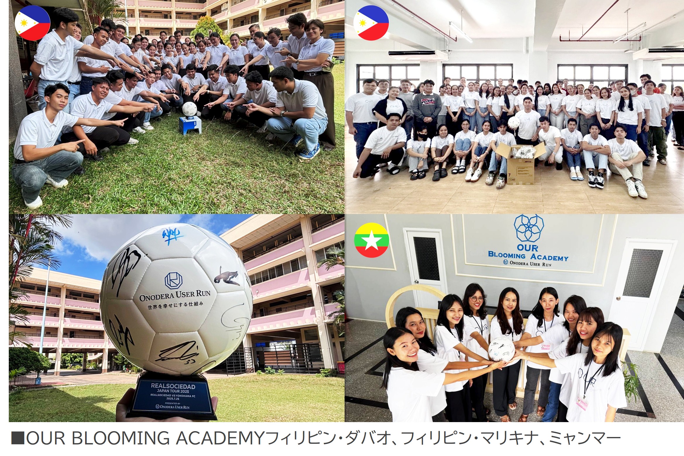本プロジェクトの第一弾として、OURがタイトルスポンサーを務めた「レアル・ソシエダ ジャパンツアー2025 レアル・ソシエダ vs 横浜FC PRESENTED BY ONODERA USER RUN」の開催記念として、横浜FCおよびレアル・ソシエダの選手の直筆サイン入りサッカーボールとともに、スポーツを通じた国際交流と、学生たちの夢や挑戦を後押しすることを目的として、横浜FCを代表して山田康太選手より、OUR BLOOMING ACADEMY(OUR海外無償教育施設)で学ぶ学生たちへ応援メッセージをいただきました。