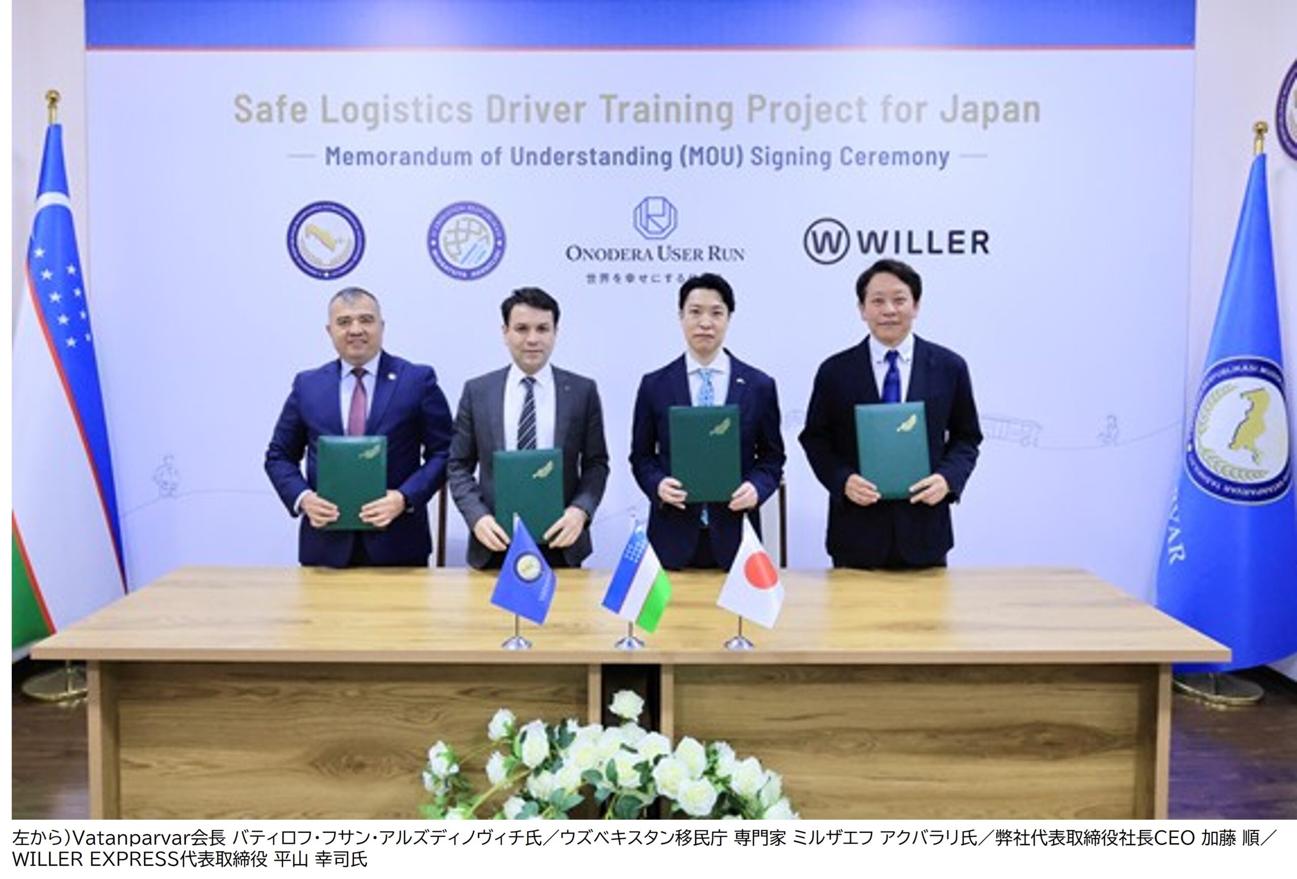 株式会社ONODERA USER RUN(代表取締役社長CEO:加藤 順 所在地:東京都千代田区 以下「OUR」)は、2026年4月15 日、ウズベキスタン共和国 内閣付属移民庁(以下「ウズベキスタン移民庁」)および同国国防支援団体「Vatanparvar(ヴァタンパルヴァル)」(以下「ヴァタンパルヴァル」)との特定技能人材の育成および日本への送り出しに関する三者間MOU(基本合意書)、ならびにバス事業者WILLER EXPRESS株式会社(代表取締役:平山 幸司 所在地:東京都江東区 以下「WILLER」)、ウズベキスタン移民庁との三者間MOUを締結いたしました。