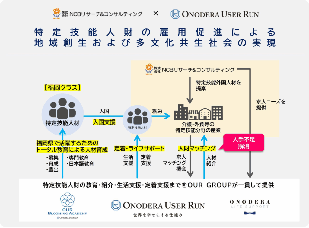 OURは、海外に自社無償教育拠点「OUR BLOOMING ACADEMY」を運営しており、現在展開中のアジア5ヵ国 (フィリピン、ミャンマー、ラオス、インドネシア、ウズベキスタン)に加え、2026年度中には、既に現地政府機関とMOUを締結しているバングラデシュおよびモンゴル国への開校も予定しています。今回の「福岡クラス」は、OUR BLOOMING ACADEMYに開設し、日本で介護、外食分野などで働くことを目指す学生に、日本語と特定技能の専門教育に加え、福岡の食や文化、方言などを含む特別カリキュラムを実施し、福岡県内の医療機関、飲食店、ホテル運営企業等の求人ニーズに対応してまいります。また、NCBR&Cは、これらの施設を運営する福岡県内の医療機関、飲食店、ホテル運営 企業等に、必要な日本語・特定技能の専門教育を受け、かつ、 福岡での就労を希望する特定技能外国人材の雇用を提案し、発掘した求人ニーズをOURに提供します。