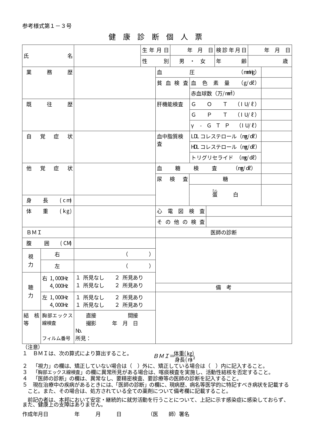提出する書類は、以下と異なる書式でも問題ありませんが、健康診断個人票に記載している検査項目は網羅しておく必要があります。