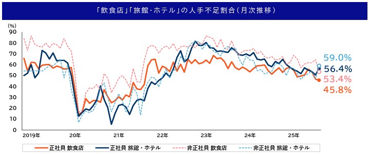こうした全体・業種別の傾向を踏まえたうえで旅館・ホテル業の状況を確認すると、正社員について「人手不足」と回答した割合は、2025年10月時点で56.4%、非正社員について人手不足と答えた企業の割合は59.0%となっています。