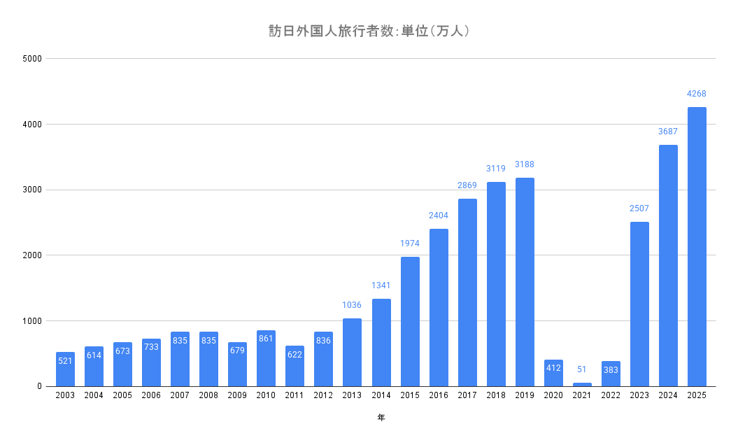 訪日観光客は、コロナ禍からの回復を経て急増しており、今後も増加が見込まれています。日本政府観光局の調査によると、2025年12月の訪日外客数は361万人で、前年同月比で3.7%増となり、12月として過去最高を更新しました。また、12月までの年間累計が4,268万人となり、年間過去最高を更新しています。